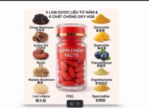 Chiết xuất nấm Chaga, nấm đuôi gà tây, nấm Linh Chi, nấm Maitake, nấm bờm sư tử, curcumin, quercetin, pterostilbene, ergothioneine, PQQ, spermidine.